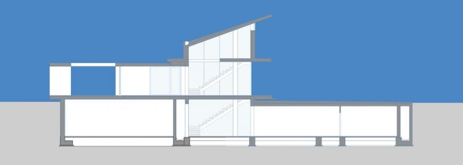 La planta principal tiene forma de «L» (ver planos), y se organiza según el espacio a doble altura ocupado por el salón. Por un lado se abre hacia la cocina-comedor, y por el otro hasta el dormitorio principal, que tiene un amplio vestidor y cuarto de baño. La escalera se sitúa justo en la esquina acristalada, exhibiéndose hacia el exterior, y conduce hasta una zona de estudio y un dormitorio. La escalera que baja al sótano está trazada justo debajo de ésta.
