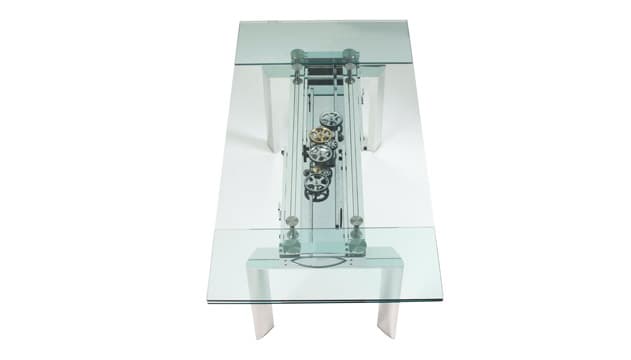 Es un mueble diseñado con toda la intención de exhibir el mecanismo de diferentes engranajes que provoca el desplazamiento de su partes móviles, por eso tiene un tablero de vidrio. El sistema funciona con baterías, y se maneja con control remoto, lo que le da a la mesa una característica aún más singular.