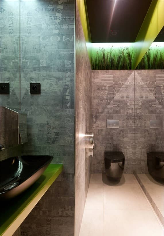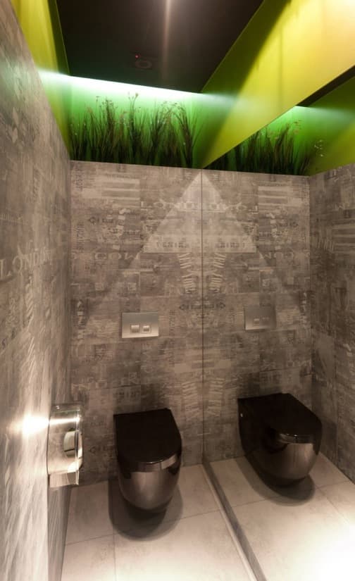 El interior de los baños también está muy bien decorado. Tanto en el de hombres como el de mujeres, se ha colocado una pared entera de espejo, un revestimiento de piedra con nombres de ciudades impresos, y el mismo recurso lumínico, aunque diferentes colores para las paredes del fondo. Mejoraría el diseño si los lavabos estuvieran más independientes del comedor.