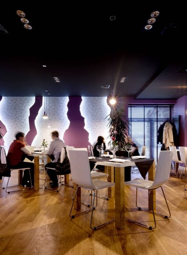 Ese juego de planos se ha potenciado con la diferencia de textura/color, y con una iluminación oculta, provocando un efecto bastante llamativo, el cual se ha utilizado incluso hasta en los lavabos. El local se ha divido en dos zonas bien diferenciadas, dejando 98m2 para el comedor y el resto para la cocina. Desde la entrada solo se ven las mesas del restaurante, quedando oculto un pequeño bar, en el que también se han utilizado los mismos elementos compositivos, como el precioso detalle del mueble de las bebidas que queda en la pared del fondo.