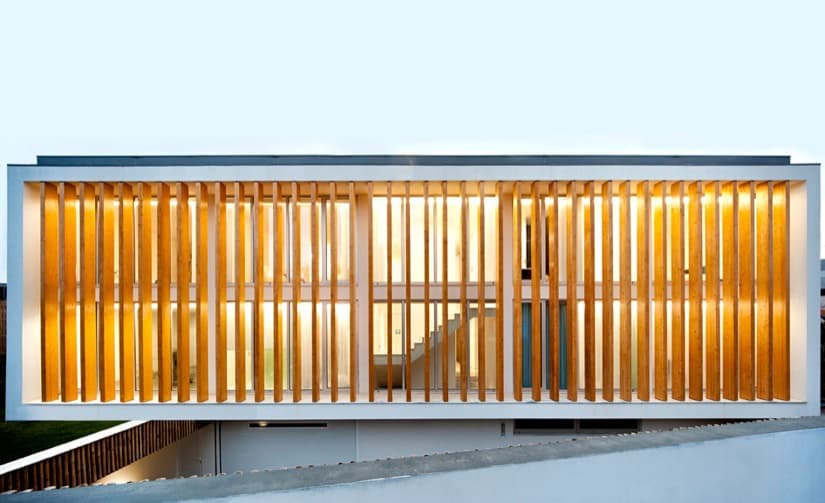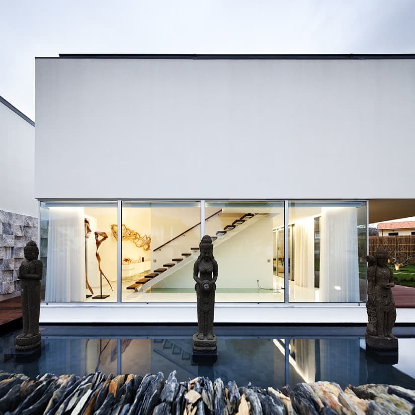 Conviene no perder detalle de los elementos verticales de madera que se han colocado en la fachada este, con el fin de tamizar la luz, y preservar la intimidad de la casa; tampoco hay que dejar de lado la lámina de agua de la entrada, y muchas de las esculturas que decoran los espacios exteriores. Lo que menos nos ha gustado ha sido la valla exterior.