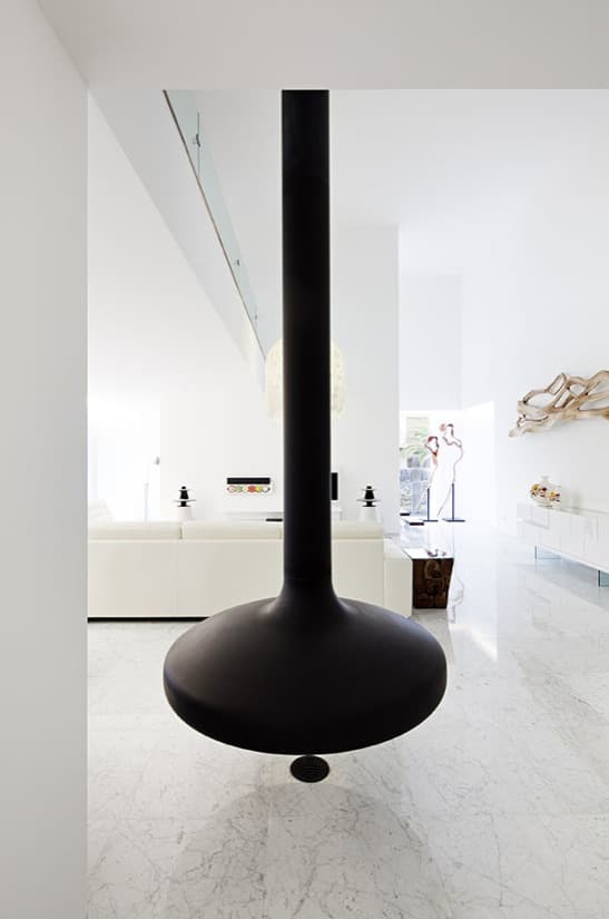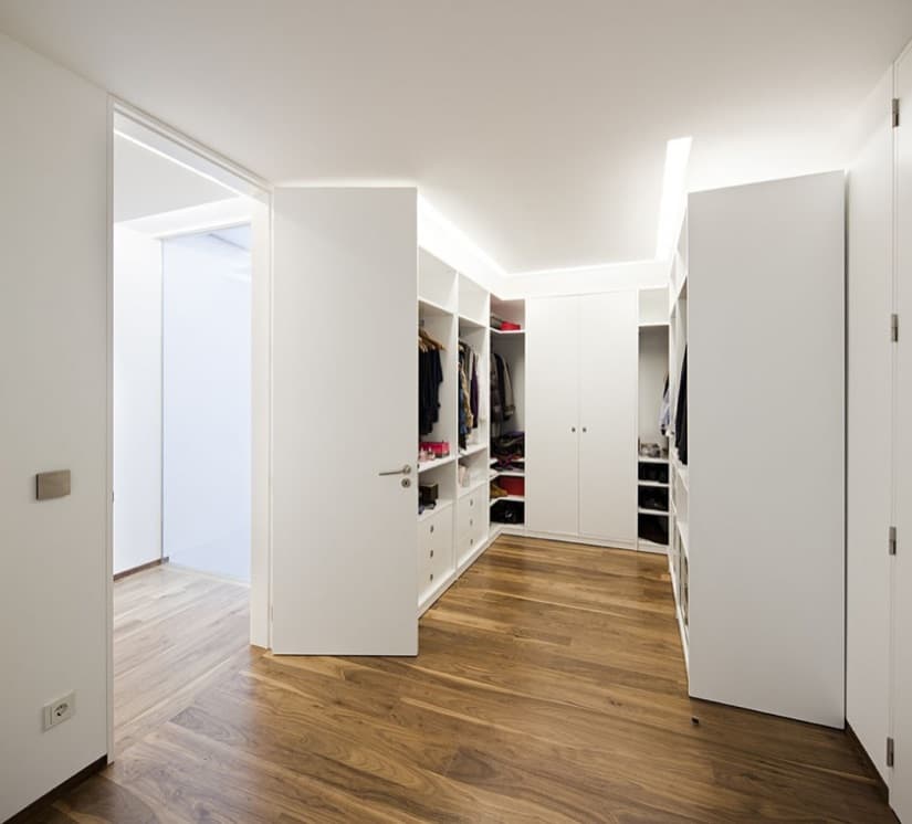 La distribución se realiza en tres plantas, una de ellas en sótano. La cocina y el comedor (8) se encuentran desvinculados del salón (14), el cual tiene un espacio a doble altura, y una preciosa escalera adosada a un muro, que conduce a una biblioteca (4). La piscina interior (11) que se ve en las fotos está en el lado sur de la vivienda, más allá de la cocina, con un gimnasio anexo (10). En este mismo nivel hay también un cuarto de invitados (13), mientras que el resto de dormitorios (6) se distribuyen en la planta alta, todos ellos con cuarto de baño dentro, y bien equipados de armarios empotrados. En la habitación principal se ha dispuesto un amplio vestidor y cuarto de baño con terraza.