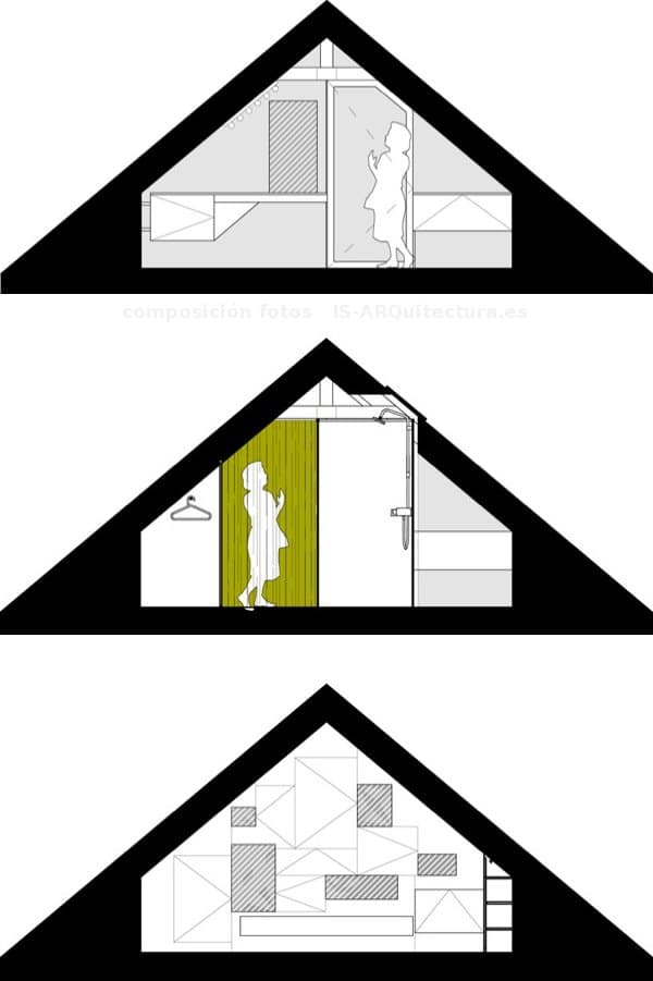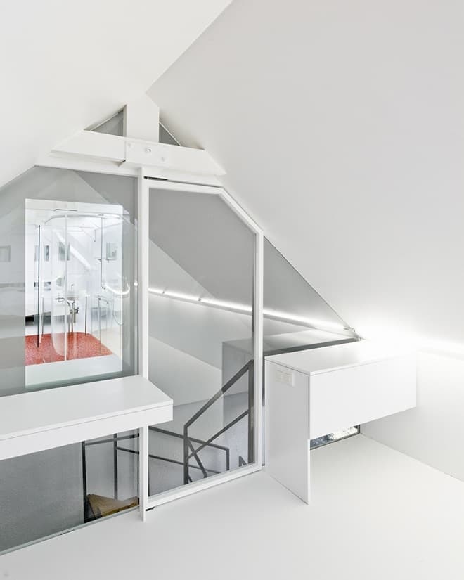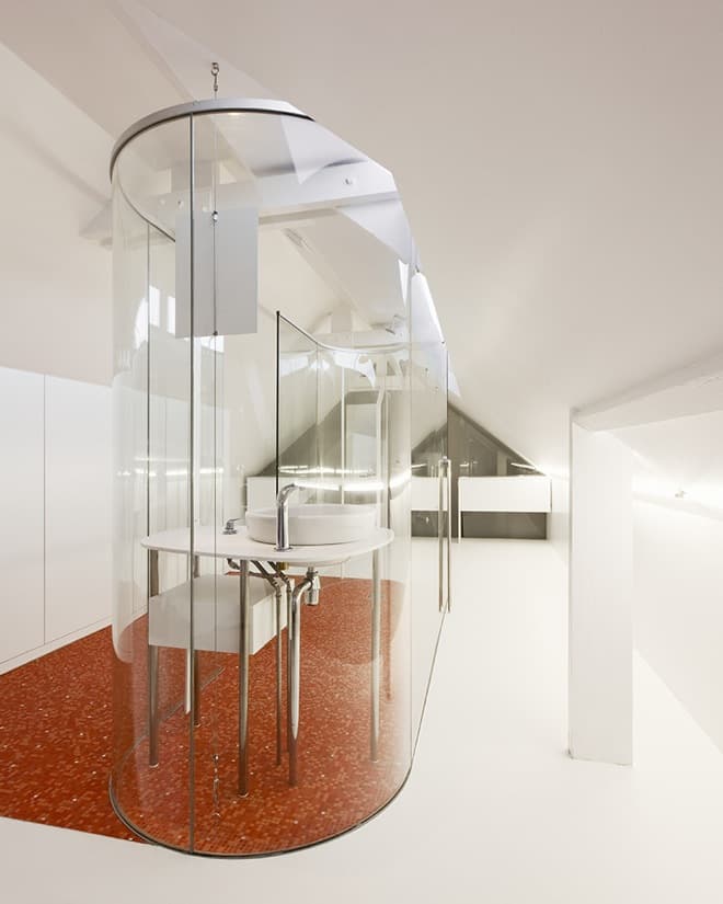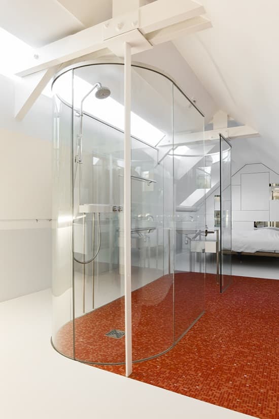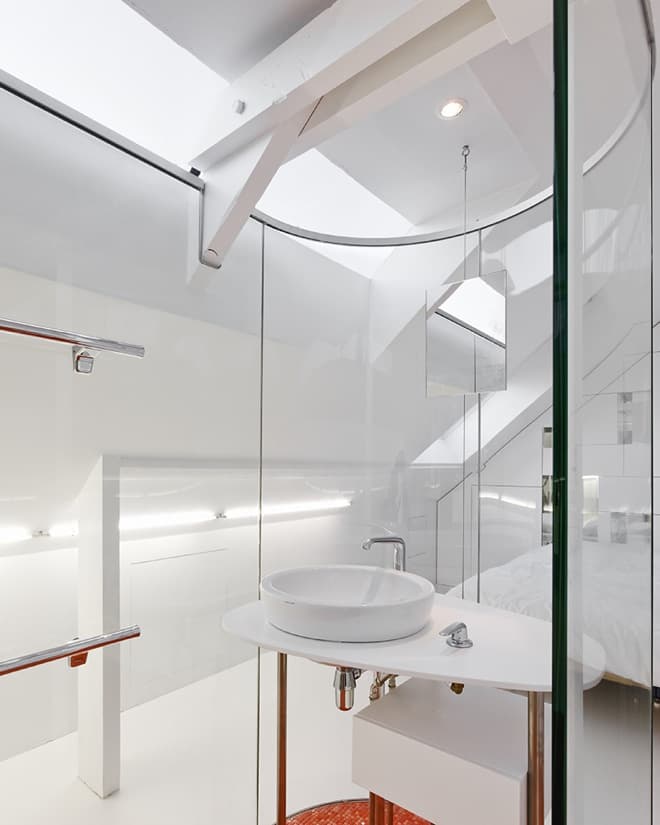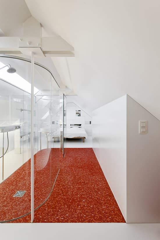 Esta ‘suite nupcial‘ es un trabajo de interiorismo bastante minimalista, que astutamente ha dejado el baño en la zona central, para separar el dormitorio de la zona de estar, pero completamente transparente gracias a una mampara de vidrio curvo. Este gesto permite que el reducido espacio se vea en su totalidad, y sin agobiarlo. Todo es blanco, incluso los elementos estructurales que han quedado a la vista, salvo el piso del baño y el que queda delante de la zona de armarios, que está marcado con una textura de mosaico rojo.
