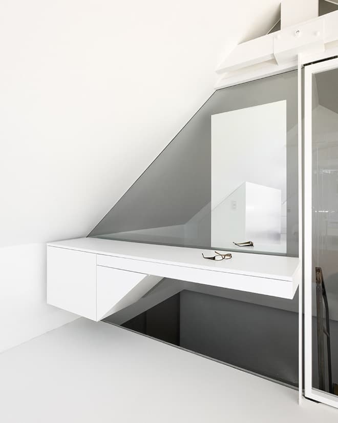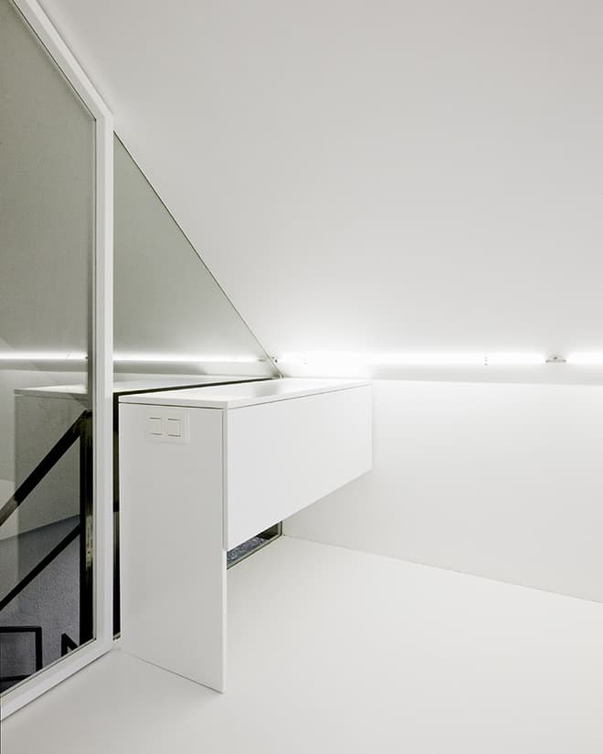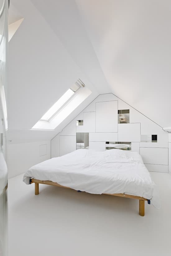 Esta habitación está ubicada en la última planta de una casa en Masnuy-Saint-Jean (Bélgica), en un espacio de apenas 30m2, con una anchura de 3.35 metros, pero muy limitado en su altura por encontrarse bajo la cubierta a dos aguas del edificio. Una ventana en uno de los faldones, y un tragaluz longitudinal, son los únicos puntos de iluminación natural de los que dispone.