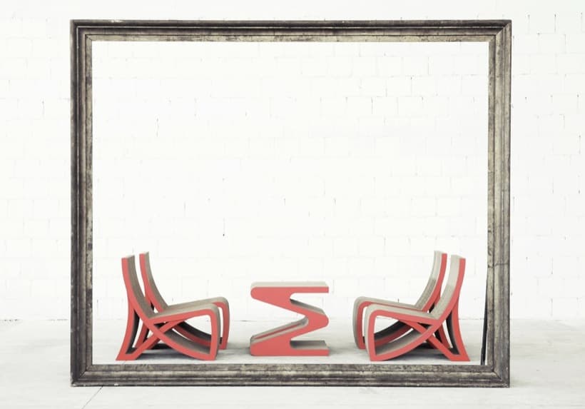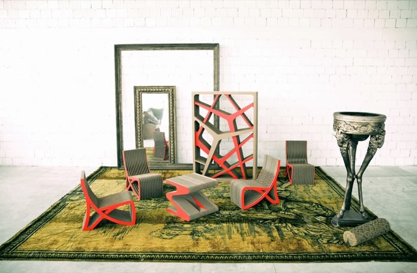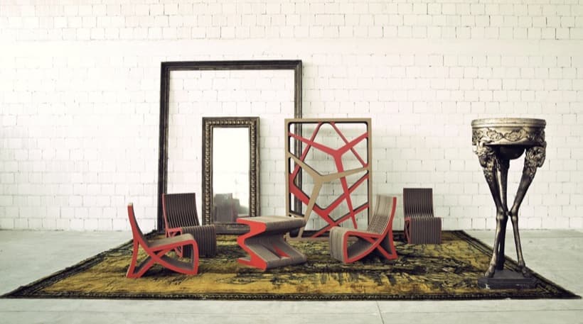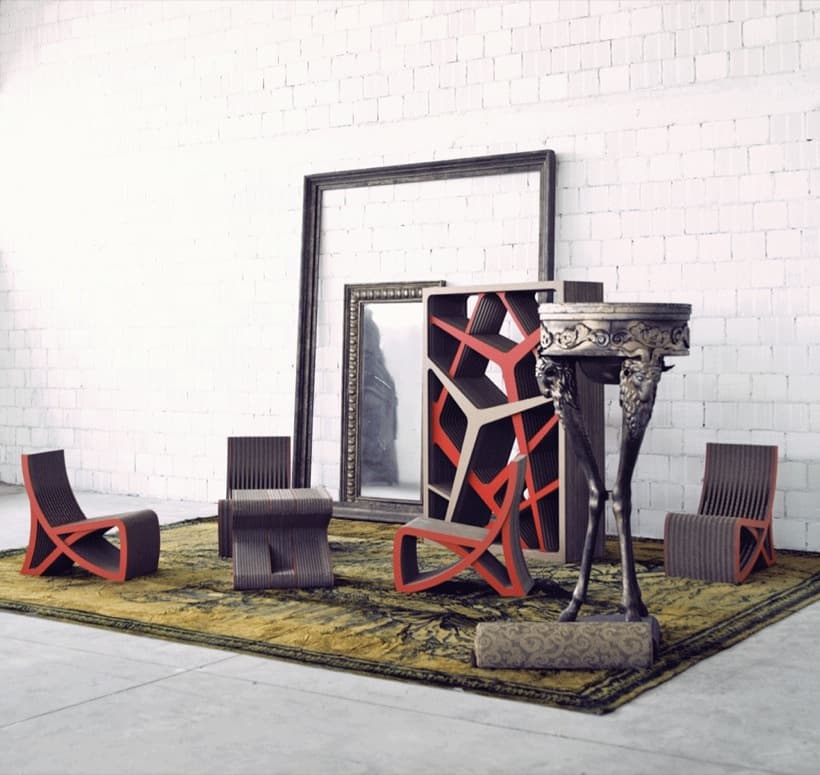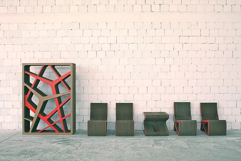 Los perfiles utilizados están diseñados para hacer que estos muebles sean resistentes, a la vez que se les ha añadido un toque de color, creando un conjunto bastante impactante, aunque inspirado en los años 20, y en algo de la famosa Silla Barcelona. El entrelazado de diferentes elementos de cartón hacen que la estantería sea el mueble más llamativo de todos, pero probablemente también el menos práctico.
