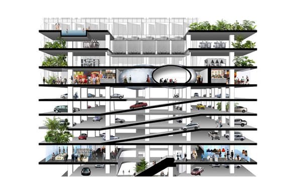 Son cinco los elementos que podemos identificar en su diseño, tres torres y dos cuerpos de marcado carácter horizontal, con grandes zonas abiertas. La base está bastante conectada con la vida urbana de la ciudad, con dos espirales de circulación, una para el tráfico rodado y la otra peatonal, con zona comercial, restaurantes y bares, y abundante vegetación. A 120 metros sobre el nivel de calle está el segundo cuerpo horizontal, con 4 niveles abiertos que alojan un restaurante con amplias terrazas para comer al aire libre, una sala multifuncional para eventos, diversos salones para reuniones de negocios, una piscina, y más espacios ajardinados.