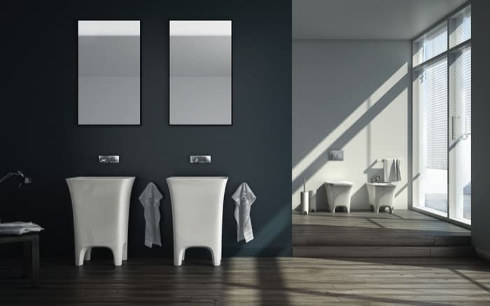 Que sepamos, los sanitarios COW probablemente sean los únicos que tienen 4 patas, y es que con ese nombre*, no quedaba más remedio. Pero si aún hay dudas de que se está rindiendo homenaje a ese animal, no hay más que fijarse en la decoración con machas negras, o incluso en la versión que tiene trazadas las líneas de corte de carne. Para nuestro cuarto de baño, nos quedamos con la versión que muestra el exterior en negro y el interior en blanco, y por supuesto con el lavabo con pedestal, o en ‘semicolonna‘, pues el que va sobre encimera se aleja bastante de la línea marcada.