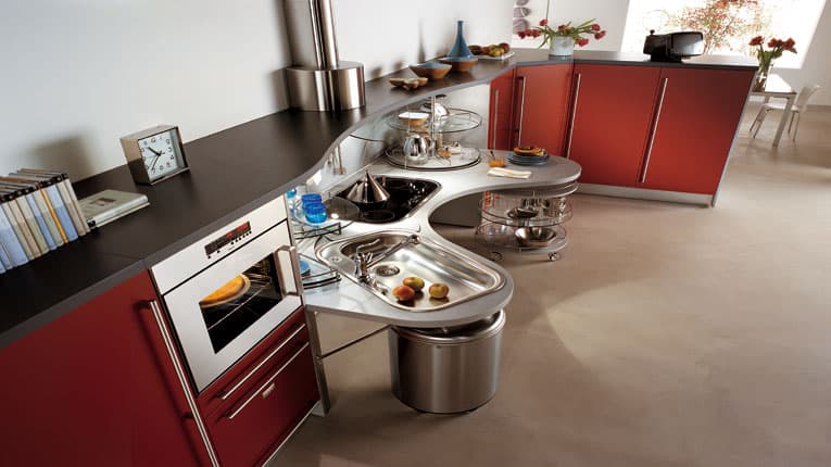 No hay que mirar este modelo de cocina como un diseño más con atractivas líneas curvas, porque en realidad los muebles Skyline Lab están especialmente indicados para personas con movilidad reducida. Prueba de ello es que se han suprimido los muebles altos, y tampoco se ha puesto ninguno bajo el fregadero ni la placa de cocinar, la intención no ha sido otra que la dar accesibilidad completa para aquellas personas que van en silla de ruedas.