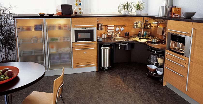 Estos muebles de cocina están repletos de grandes detalles destinados a hacer más fácil el trabajo en la cocina. No solo tienen un diseño envolvente para que todo esté a mano, también hay bandejas giratorias, el fregadero tiene menos profundidad, el cubo de la basura tiene ruedas, los armarios vienen con bandejas deslizantes… Como se puede ver en una de las fotos, también hay una solución pensada para instalarse en un rincón. Todo un acierto!