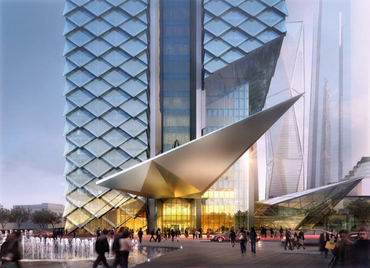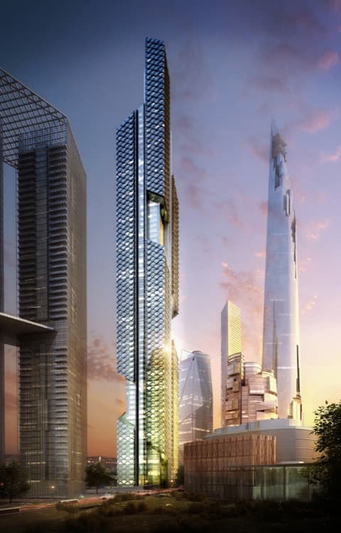 Estas dos torres (de 450 y 390 metros) están destinadas a alojar un programa de viviendas y de oficinas, además de contar con espacios para tiendas en su interior. Son las Dancing Dragons, y destacan por tener un aspecto exterior que, según su autores, tiene influencias de la cultura tradicional coreana, pero sobre todo por la sucesión de estructuras en voladizo, como si se tratara de ‘torres parásito‘ adosadas a su fachada, con unos bellos cortes en diagonal al principio y final de cada una de ellas. También los hay que opinan que su diseño es una ‘versión’ de la torre que aparece en la City 17 Citadel del videojuego Half-Life,… es posible.