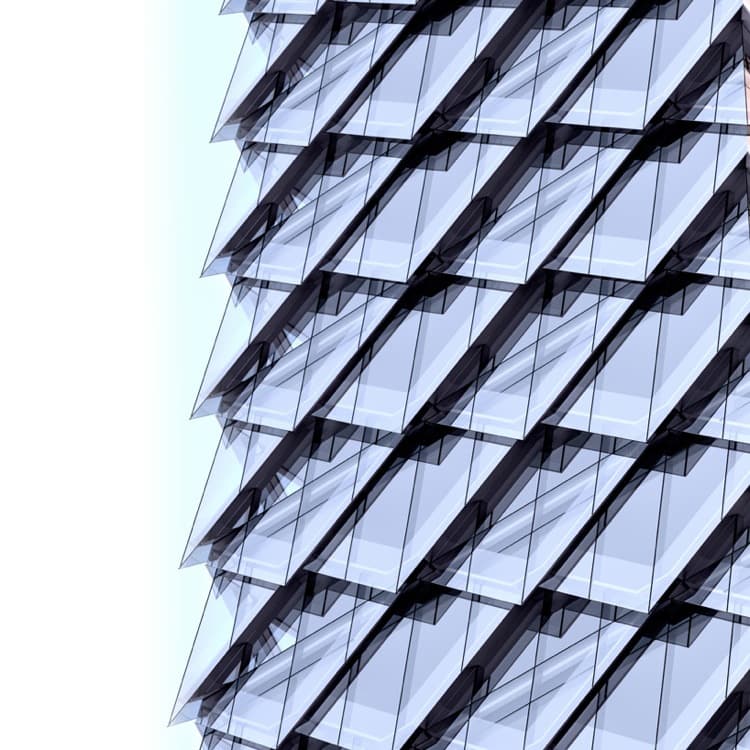 Otro aspecto bastante potente de estos rascacielos es la peculiar textura de escamas que crea su fachada acristalada, con grandes elementos con forma de rombo que disponen de rejillas de ventilación operables (de 600mm).