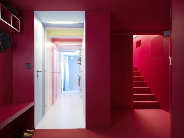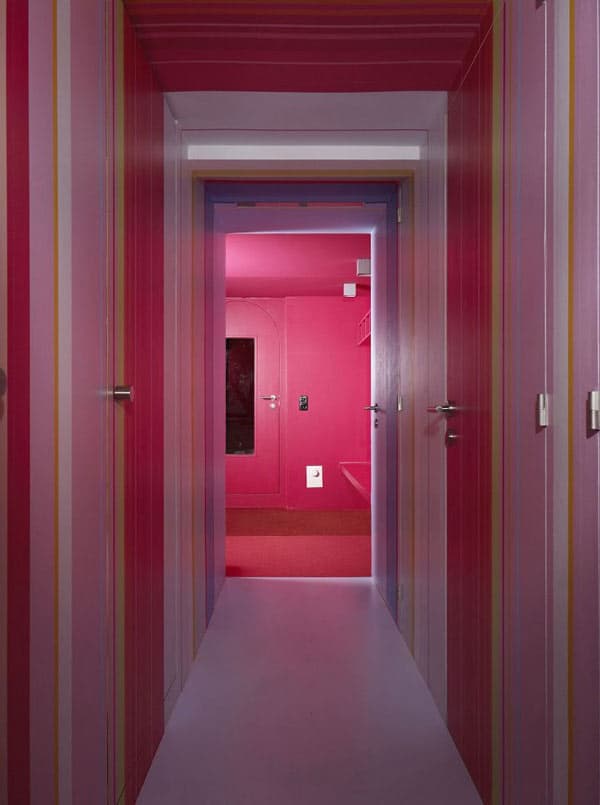Con el fin de suavizar el contraste con la parte antigua, el revestimiento exterior de madera de alerce de la obra nueva fue envejecido artificialmente. El acabo interior está bastante renovado, llegando a utilizarse en algunas zonas unos colores muy vivos, mientras que otras quedan revestidas de madera.