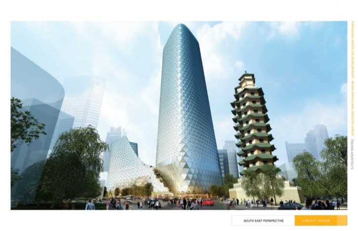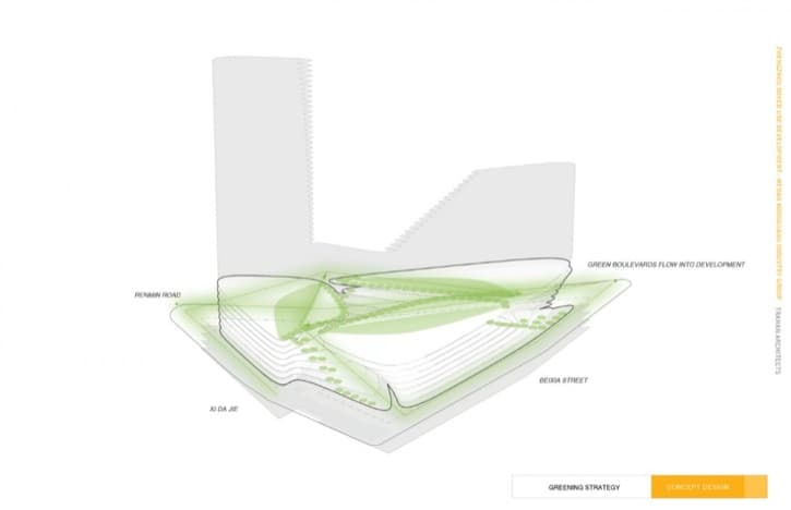 Estos renders corresponden a una propuesta urbanística para el centro de la ciudad de Zhengzhou (China), la metrópolis más grande y capital de la provincia de Henan, con una población que supera los 8,5 millones de habitantes. Con el fuerte crecimiento que está experimentando el país, esta zona central se pretende desarrollar bajo un plan maestro que ponga en práctica dos partes bien diferenciadas: la ecológica y la de infraestructuras.
