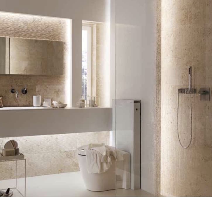 A partir de un cuidado diseño de tanque de descarga para inodoros, algo  más plano que el convencional, surge la colección de soportes Monolith. La cisterna queda oculta en un bloque  con estructura de aluminio y acabado de vidrio templado, aportando una moderna alternativa al cuarto de baño tradicional, al tiempo que ahorra espacio, algo que puede ser fundamental en determinadas reformas.