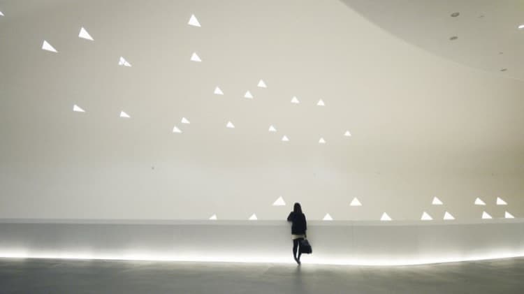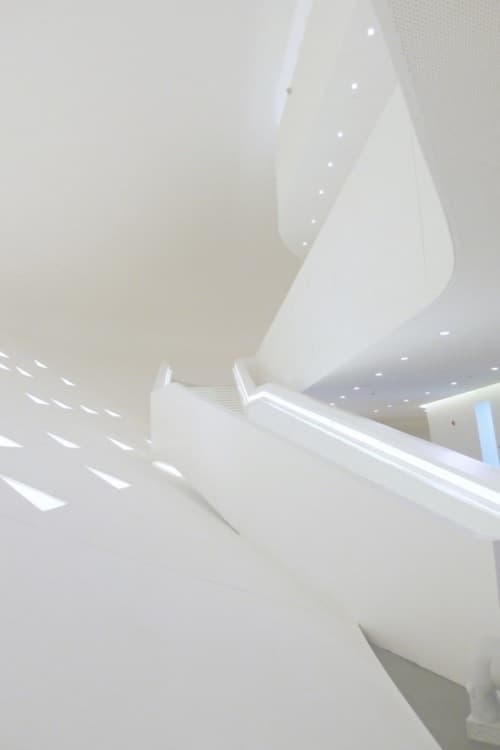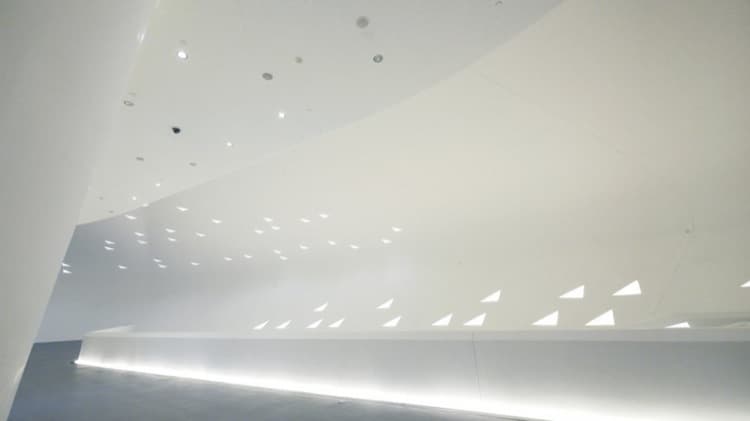 El interior sigue reflejando la forma curva, con espacios que parecen infinitos, muy neutros, tan solo alterados por unos pequeños huecos triangulares dispuestos de manera aleatoria. La primera planta está destinada al hall de acceso y a una cafetería, mientras que en la segunda y tercera encontraremos los espacios de exposición. Las áreas de almacenamiento están distribuidas en cada nivel, con paredes móviles que aportan flexibilidad a los espacios de muestra.