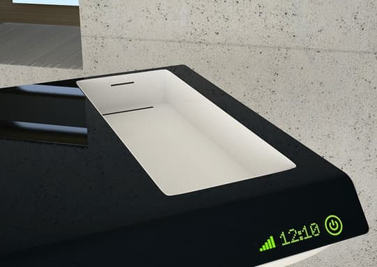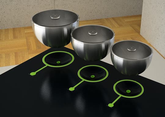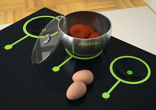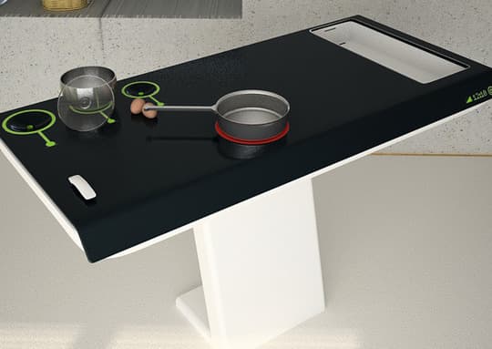 Las imágenes corresponden a una isla de cocina inteligente llamada Future Cook, donde la superficie, además se servir para la cocción, también funciona como pantalla informativa para la elaboración de recetas. Lo que se ve en un extremo es una zona de lavado.