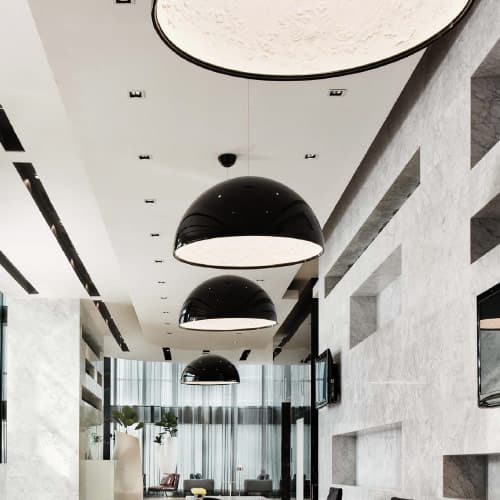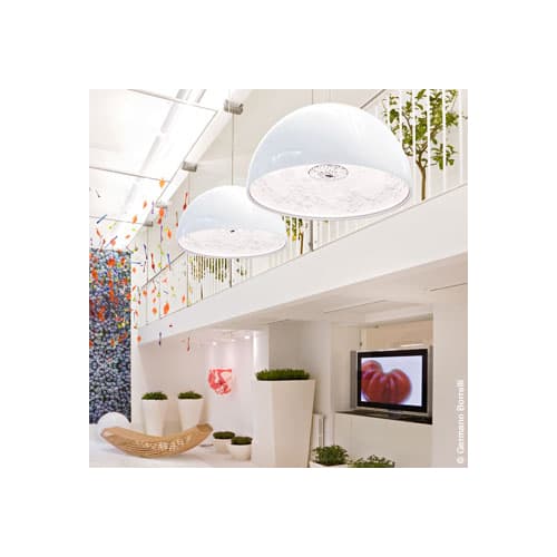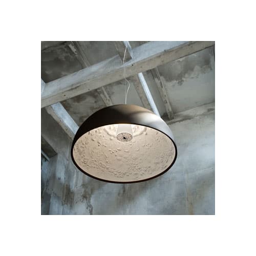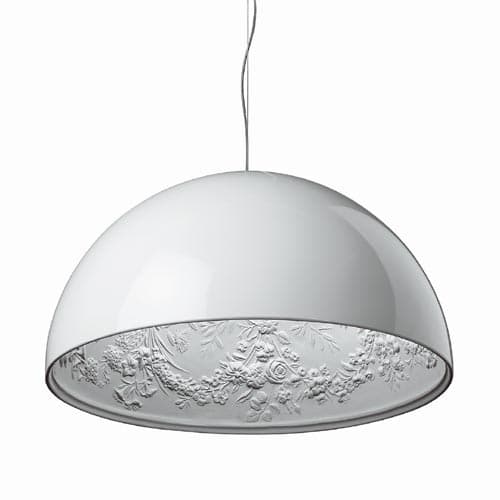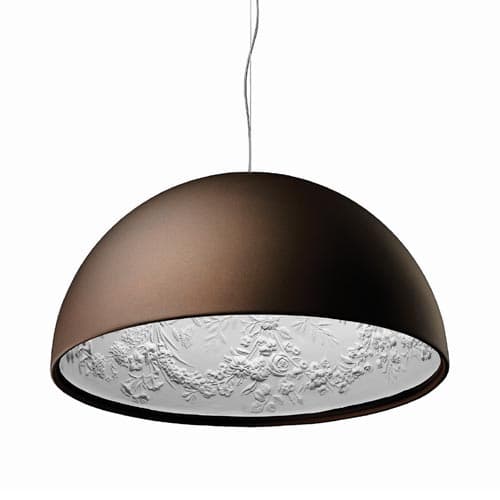 Skygarden es ante todo una moderna lámpara colgante, pero con el toque clásico que el diseñador Marcel Wanders le suele dar a sus diseños. Su aspecto es el de media esfera con acabado exterior liso, disponible en color negro, blanco, óxido, o dorado. Pero en su interior presenta un bajorrelieve con motivos florales, tanto en la superficie de la pantalla como en la cara inferior de su difusor de vidrio. Estas filigranas creativas son un guiño descarado a la decoración de los techos de muchos palacios nobles.