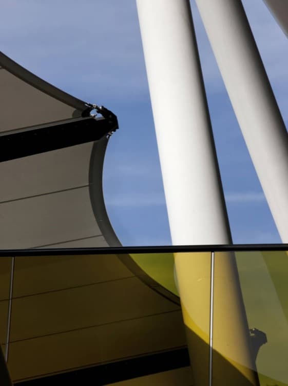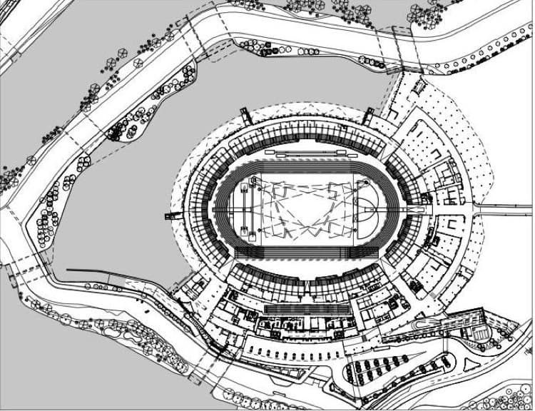 Los planos de sección del estadio son bastante reveladores: la altura de las torres de focos es casi la misma que el vuelo de la cubierta. Para garantizar su estabilidad, el equipo de ingenieros ha diseñado un sistema de cables tensados que une nudos superiores de cada torre con el resto de la estructura. Pero aún así, este estadio olímpico se recordará como uno de los menos atractivos de la historia.
