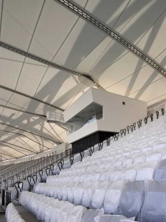 Como viene siendo habitual en este tipo de edificios, sus dos graderíos están formados por vigas prefabricadas de hormigón. No ocurre igual con los pórticos, que están compuestos por un sistema metálico de acero (en color negro). A éste se superpone una estructura tubular (en blanco) que soporta toda la cubierta, que está completada por láminas textiles tensadas.