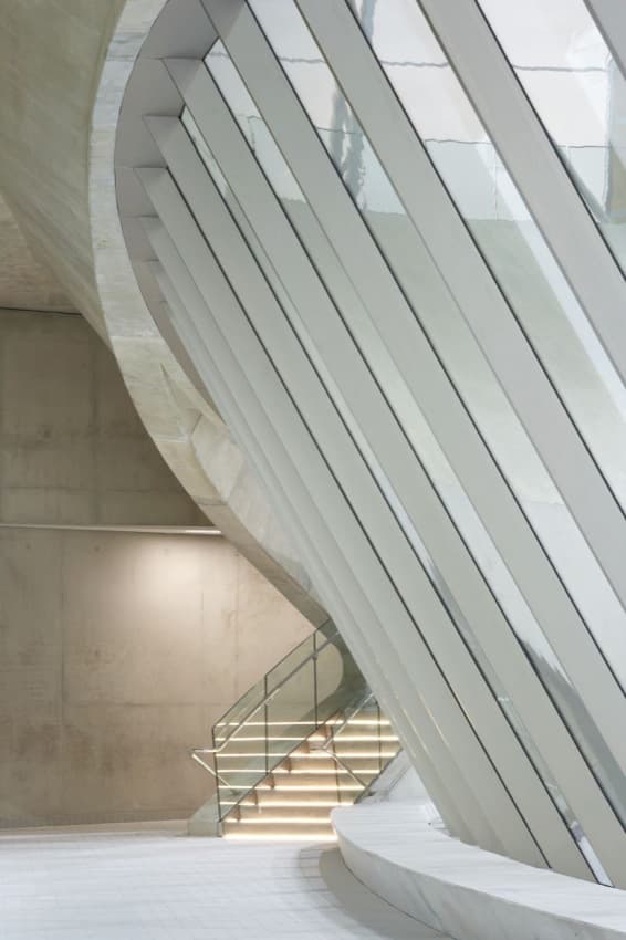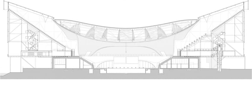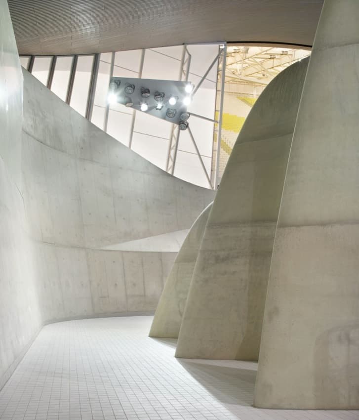 Si impactante es su cubierta, también lo es todo lo que se puede ver de su interior (incluidos trampolines). Este Centro Acuático lleva el sello inconfundible de su autora: la arquitecta Zaha Hadid. El vídeo timelapse que acompaña a este artículo da una idea de toda la tecnología que se ha tenido que emplear para construirlo. Es interesante fijarse en los soportes metálicos temporales que aparecen mientras se iba montando su impresionante cubierta alabeada, porque una vez terminada tan solo queda apoyada en determinados extremos.