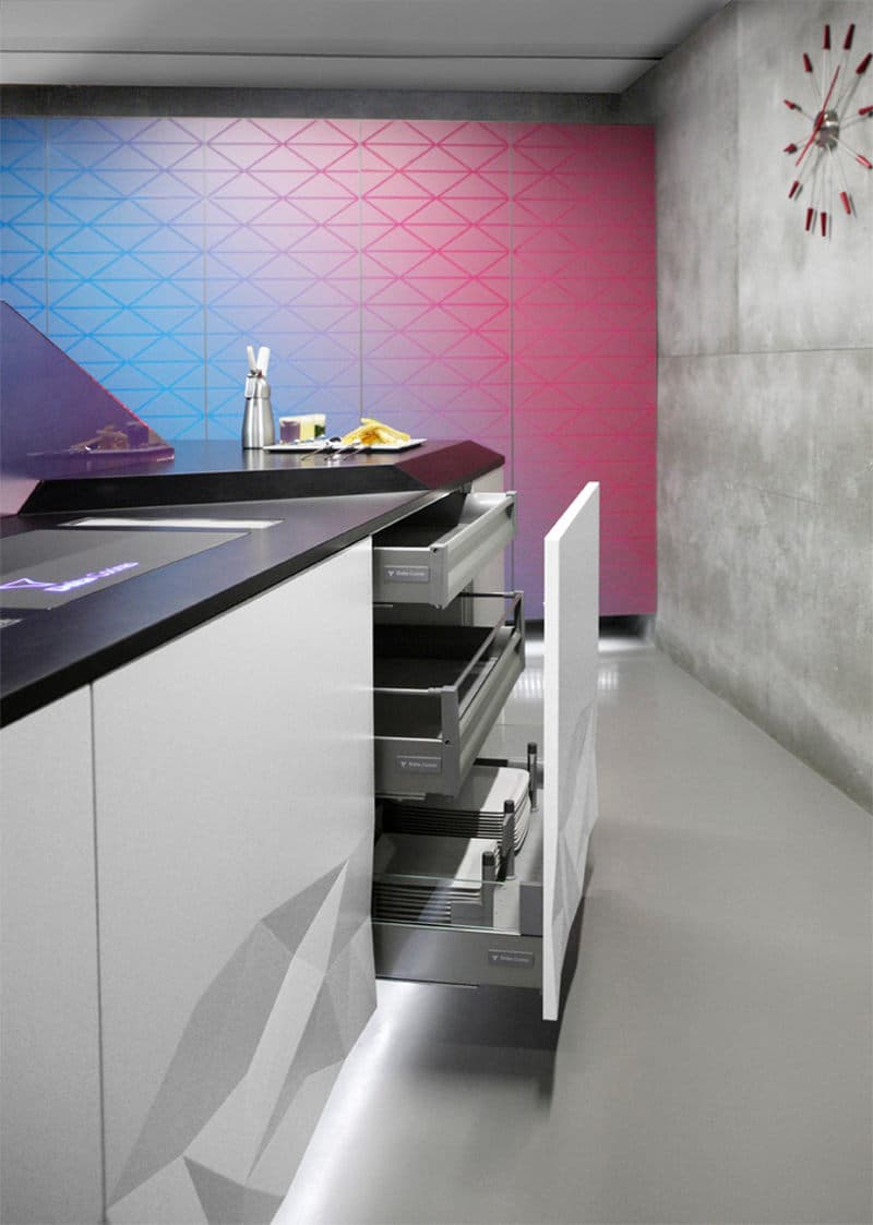 La partes vidriadas pretenden recordarnos a la aurora boreal, provocando una fusión de colores primarios. Existe la posibilidad de combinar diferentes colores y acabados, para que el resultado final sea distinto en cada cocina.