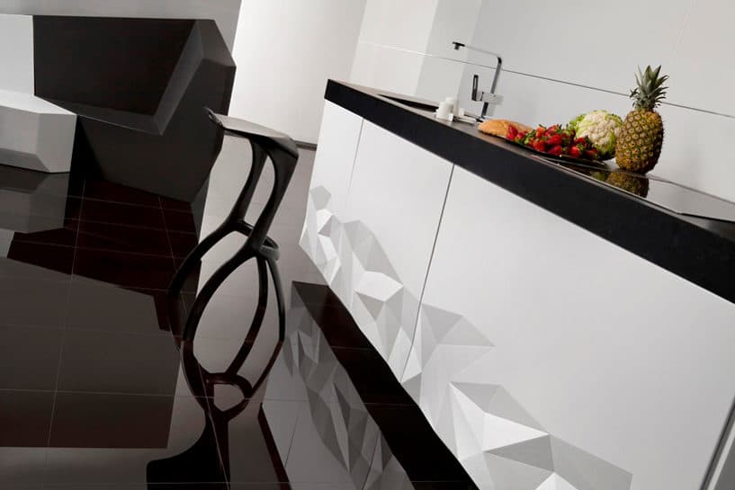 Salta a la vista que la peculiaridad en esta moderna cocina es la forma de crear irregularidades en la superficie frontal de sus muebles. Es ARTICA, una cocina atrevida que además apuesta por lo último en texturas, teniendo muy presente el uso de materiales de bajo impacto ambiental. El resultado final es una original composición, con profundidad en sus formas, que crea un interesante juego de luces y sombras. Lo consigue sin perder la continuidad en cada una de sus puertas.