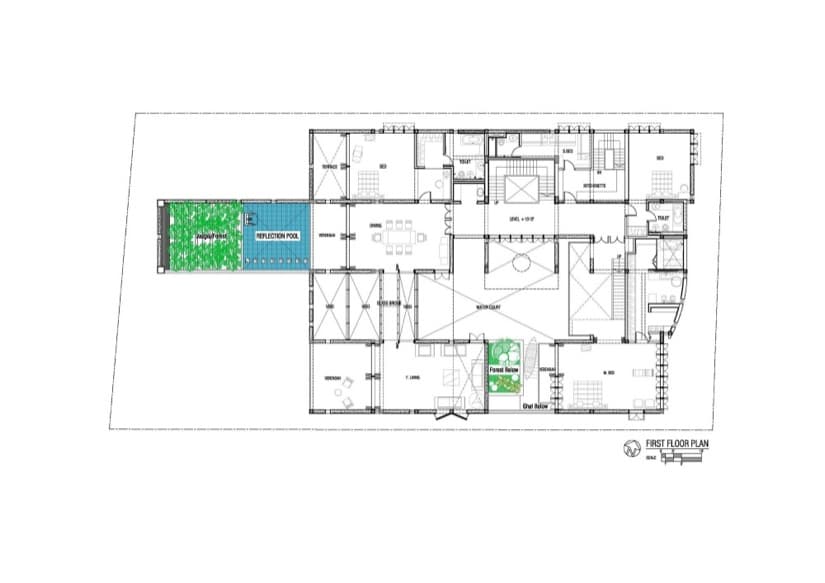 La composición parte de un cubo que deja en su interior un patio, y en él un estanque de agua que, además de servir como piscina, funciona como espacio para refrescar la casa en verano. Podríamos considerar que la vivienda funciona muy vinculada a este vacío central, como la típica casa patio, a pesar de disponer de otros vacíos.