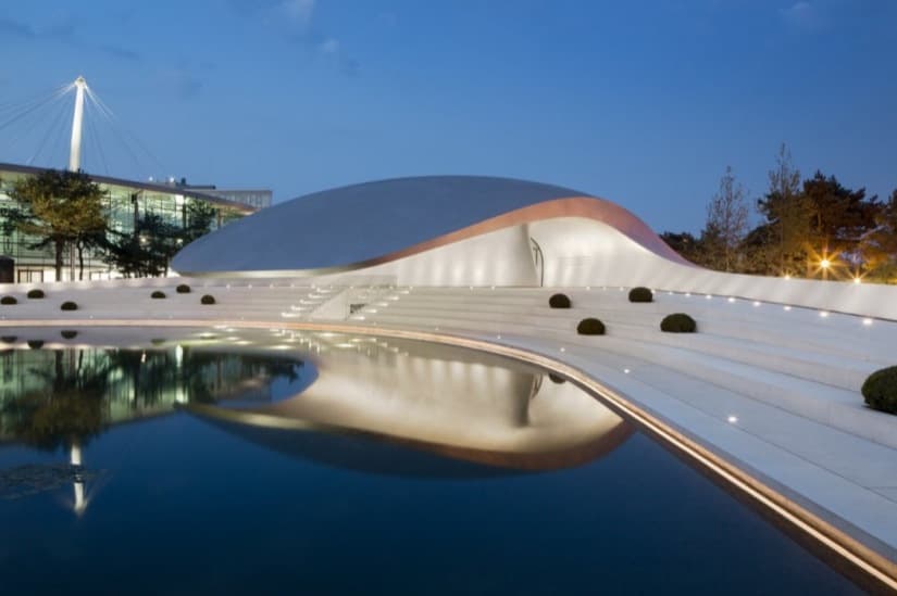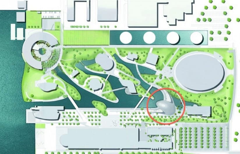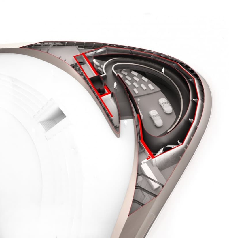 El citado Pabellón tiene una superficie de 400m2 para espacio dedicado a exposiciones y presentaciones. Pero su silueta llama la atención desde casi cualquier parte del parque. Sus líneas curvas se reflejan en la laguna, ofreciendo una imagen muy dinámica y apropiada para la marca que representa, fundiéndose en el entorno que en su día diseñaron los arquitectos paisajistas de WES. Lo más impresionante del diseño es su continuidad, no se ven juntas. Y que todo el exterior está revestido con 620 planchas de acero inoxidable mate, preparadas en un astillero de Stralsund, y ensambladas en el lugar. Como se puede ver en el siguiente render, su estructura es metálica.