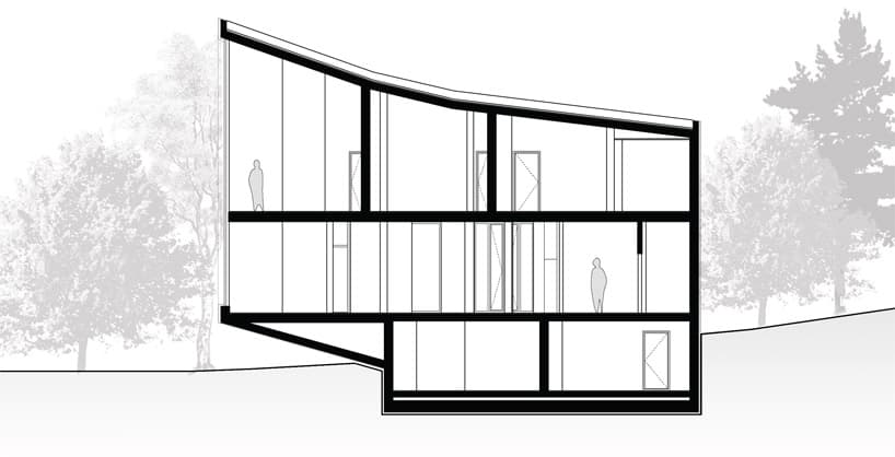 Según el plano de sección, vemos que hay un sótano y dos plantas sobre rasante. A pesar de la forma quebrada y caprichosa de la envolvente, por dentro es una casa bastante habitable: los dormitorios y la cocina están cómodamente amueblados gracias a paredes ortogonales. Tan solo el dormitorio último, el de los hijos, es el que se resuelve siguiendo las diferentes direcciones de la fachada, mediante los muebles de escritorio. En el extremo opuesto está el dormitorio principal, tratado como una suite, y entre ambos hay una sala de estudio.