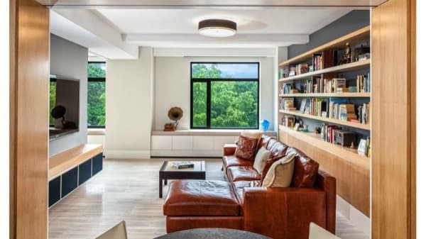 No cabe duda que se trata de una vivienda de habitaciones muy espaciosas con grandes ventanales. Posee una decoración un tanto ecléctica, e incluso hasta vintage, aunque la del salón necesita un retoque. Nos gusta especialmente la sala contigua para ver la televisión, con un cómodo sofá de cuero, y una estupenda librería al fondo. Y por supuesto el comedor, con los muebles justos y lámparas para crear un ambiente sobrio. La cocina tiene el aspecto de estar bien equipada, sobre todo en lo que respecta a frigorífico. Suponemos que la placa de cocina va acompañada de unas de esas campanas extractoras ocultas en el mueble de la encimera.
