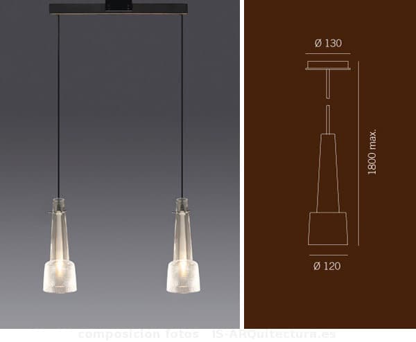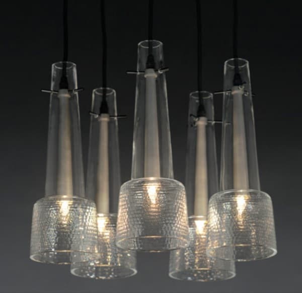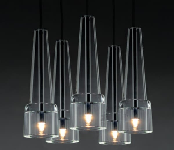 Keule es una colección de lámparas para colgar que está compuesta por las versiones Keule 1, 2, y 5, dependiendo del número de lámparas que lleve el conjunto. Es un original diseño cónico que en la parte inferior se ensancha terminando en forma de campana. Tiene una pieza interior también de vidrio que es donde va encajada la pequeña bombilla (40w G9). Los acabados pueden ser completamente transparentes y lisos, con una parte esmerilada, o incluso en vidrio blanco.