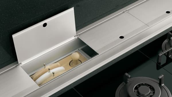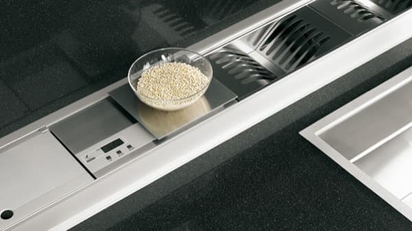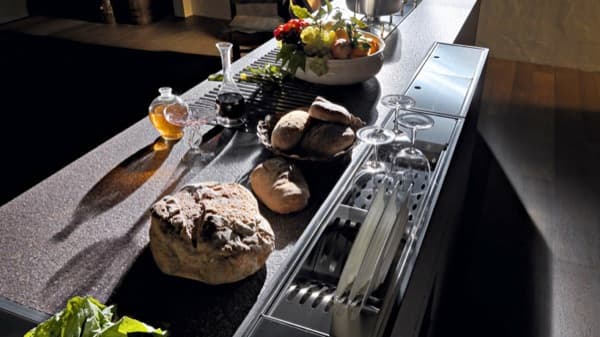 En las nuevas mejoras añadidas hay una que nos parece fantástica: es posible dejar oculto todo el fondo. También hay un tablero deslizante para aumentar la superficie de trabajo, estantes abatibles, una regleta de enchufes (con USB), además de una báscula, escurreplatos, bastidor para las botellas, soporte para rollos de papel, ganchos para utensilios,… incluso campana extractora. También está disponible el nuevo diseño de mueble en isla, con un elemento que separa parcialmente la cocina del resto de la sala (suponemos será opcional).