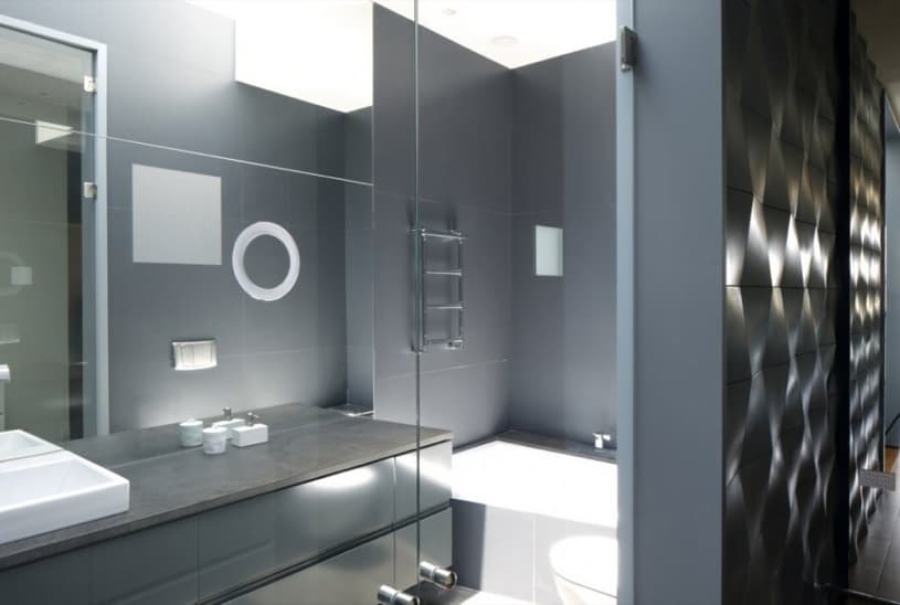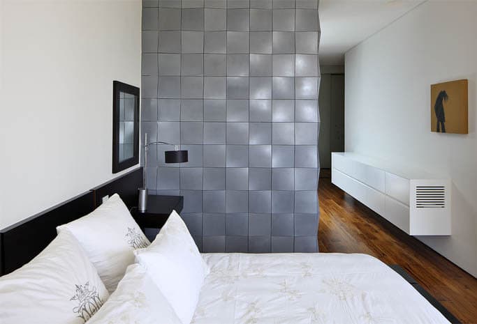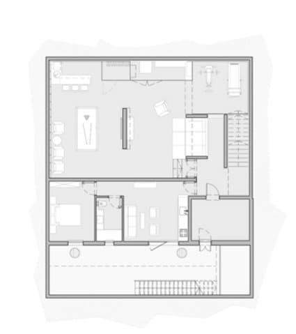 Pero dentro también tienen presencia los módulos de hormigón, marcando la altura de determinados muebles y elementos que decoran la casa. Hay una planta sótano destinada a zonas de entretenimiento, gimnasio, sala, cocina, y dormitorio, que ventila a una especie de patio inglés lateral. La planta baja tiene un amplio salón-comedor, que conecta visualmente con la mitad de la cocina, mientras que en la planta alta se distribuyen cuatro dormitorios, tres de ellos comparten cuarto de baño, pero el principal dispone de vestidor, y baño propio.