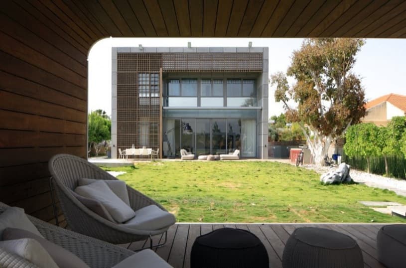Su aspecto monolítico, y sin ventanas visibles, nos invita a pensar que el uso de este edificio no tiene nada que ver con el residencial, sin embargo se trata de la Casa K, construida en una zona rural del centro de Israel. Su volumetría parte de un cubo de 9 metros de altura, formado por elementos prefabricados de hormigón armado, dejando muy opacas tanto la fachada principal como las laterales, y ocultando los huecos tras celosías de madera de tramado ortogonal.