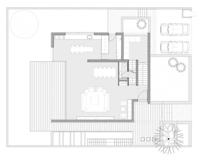 Casi todos los suelos son de madera, las paredes blancas con puertas de armarios camufladas en el mismo color, y podemos ver idéntico lenguaje tanto para los muebles de la cocina como los de los dormitorios, destacando una librería cuyos estantes forman un laberinto. Los baños tienen un acabado gris, combinando revestimientos cerámicos, y encimera de hormigón. La parte trasera de la vivienda se abre al jardín con grandes huecos que ya no quedan ocultos por la celosía.