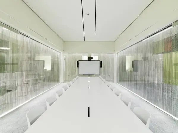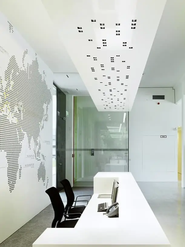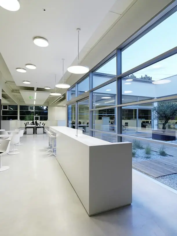 El edificio está organizado en tres ejes, y equipado con tecnología puntera, con grandes espacios de trabajo separados por elementos a media altura. La parte central está destinada a la comunicación del personal y los clientes, con diferentes áreas para reuniones, salones para conferencias, incluso con zona de cocina y de recreo.