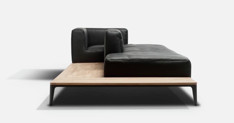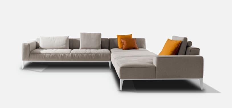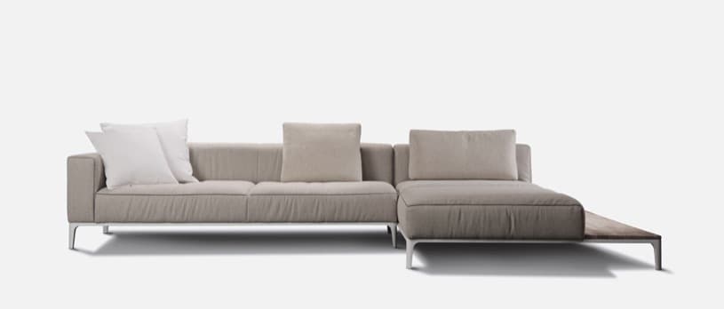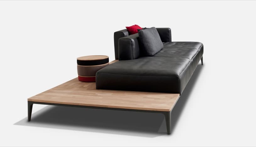 Hay partes que disponen de una superficie anexa formada por un tablero de madera, sobre la que poder colocar objetos, elementos decorativos, o apilar algunos de los soportes auxiliares circulares disponibles en la colección. La estructura de este sofá es de aluminio, en una sola pieza (sin soldaduras) y en diferentes colores. Todo ello para que combine perfectamente con la tapicería elegida (piel o tela).