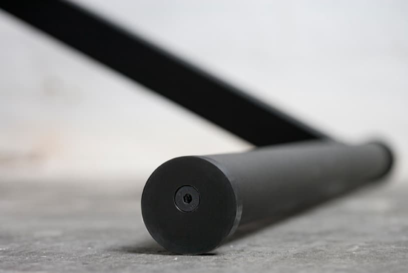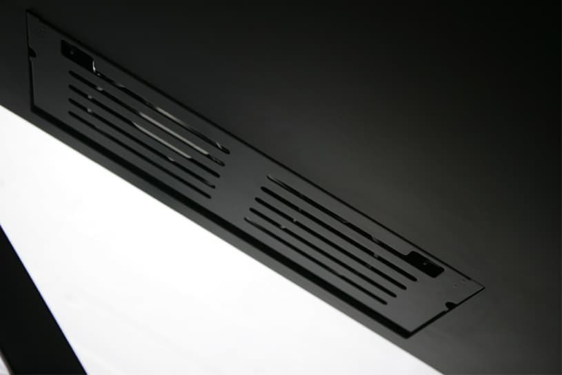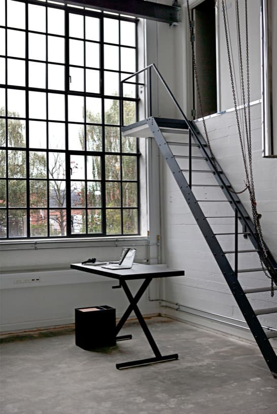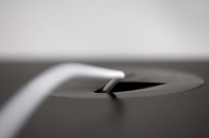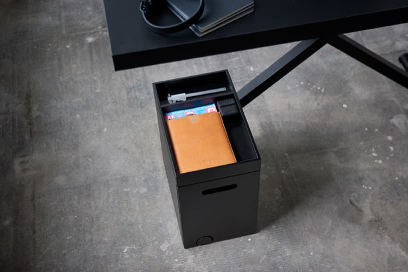 Todas la partes mecánicas de esta mesa de trabajo están escondidas en su estructura de acero, salvo la manivela, que sirve para regular su altura. En uno de sus apoyos va acoplada una caja para almacenamiento de material de oficina, mientras que en el espesor del tablero lleva insertado un compartimento para tener los cables recogidos, aunque desconocemos si incluye también la posibilidad de enchufar dispositivos, como vimos en la mesa Tambour.