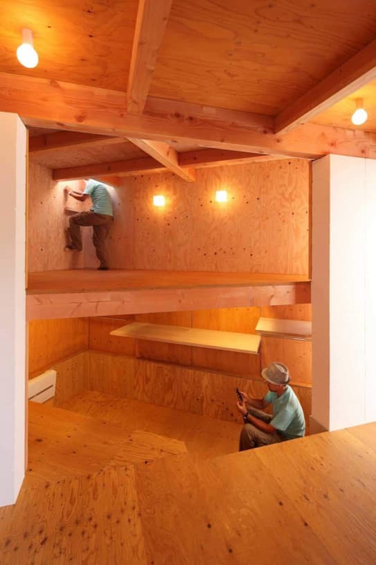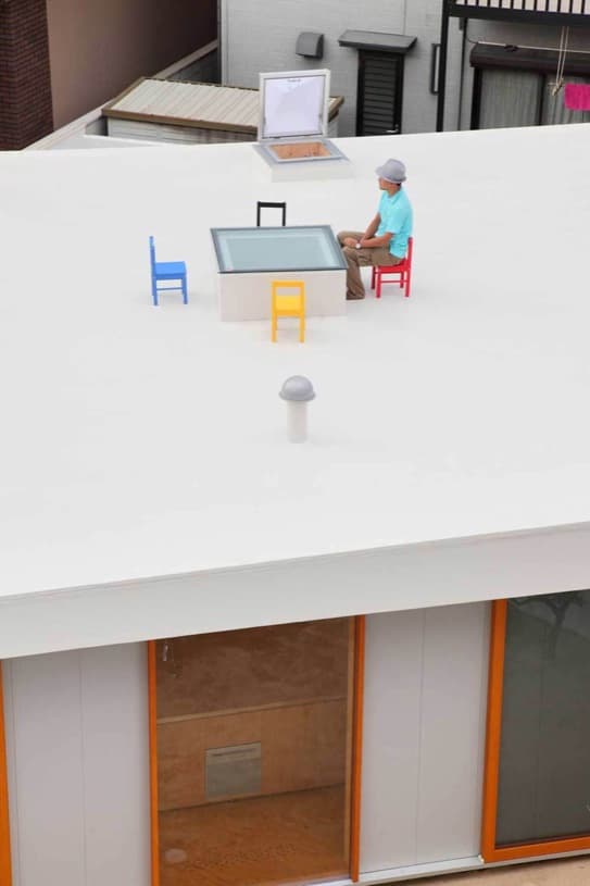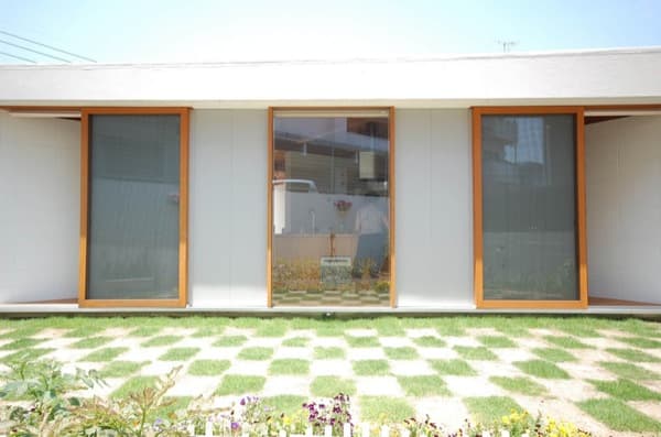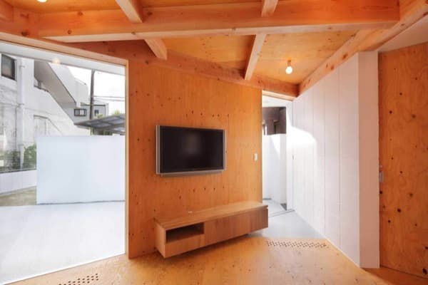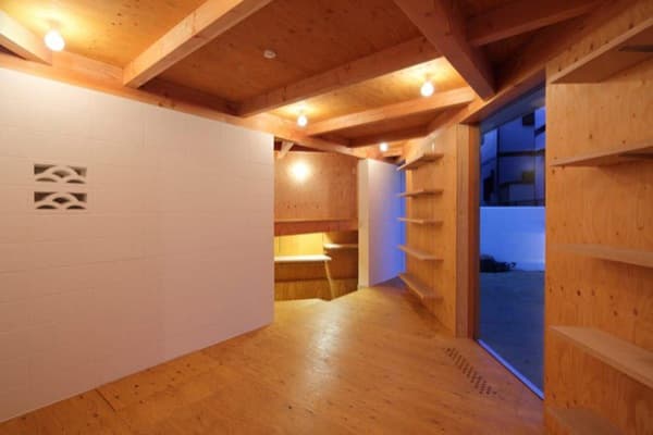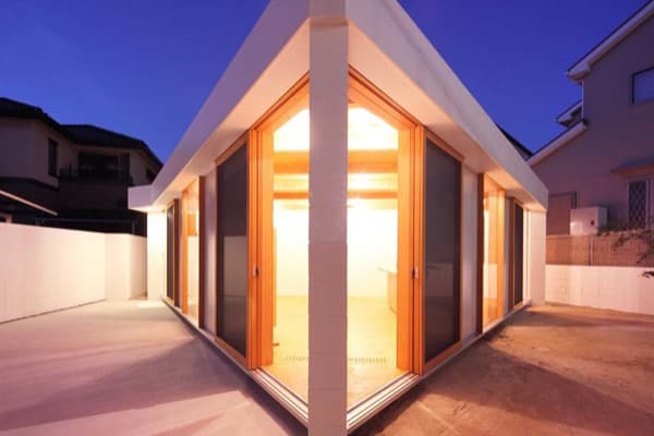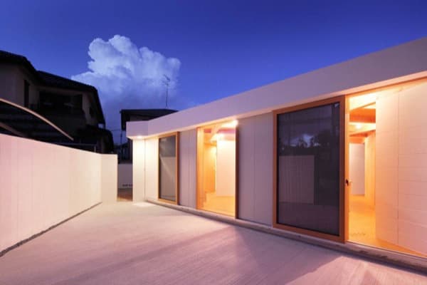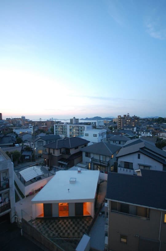 Esta vivienda unifamiliar se ha construido en Kitakyushu, una ciudad de la prefectura de Fukuoka (Japón). La Casa Tanaka es una demostración de cómo se puede encajar un programa de un dormitorio en una planta de forma cuadrada que ha sido llevada a la de un rombo, pero que está atravesada (siguiendo su dos diagonales) por unos muros de bloques de hormigón. O lo que es lo mismo: es una casa en 4 triángulos. Esta disposición del edificio en la parcela ha dado lugar a cuatro patios similares en el exterior.