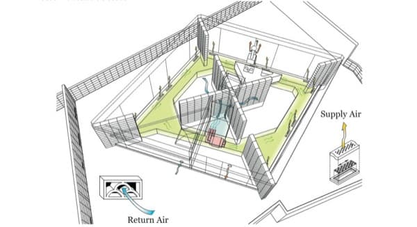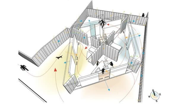 El proyecto parece una locura, pero está bastante meditado. Otro detalle que llama la atención es que los principales espacios quedan comunicados por grandes huecos, pues tan sólo encontraremos puertas para acceder al cuarto de baño, o al inodoro. En este triángulo, ha quedado espacio para el ropero y un loft, a través del cual se puede acceder a la azotea de esta intrigante casa. Una claraboya en el centro permite ventilación cruzada a toda la vivienda, según se explica en los dibujos que marcan los flujos del aire.