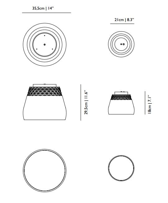 La lámpara Valentino se puede adquirir en un acabado blanco, negro, cromo, y dorado. Y está disponible en dos tamaños: de 35,5cm, y de 21cm de diámetro.