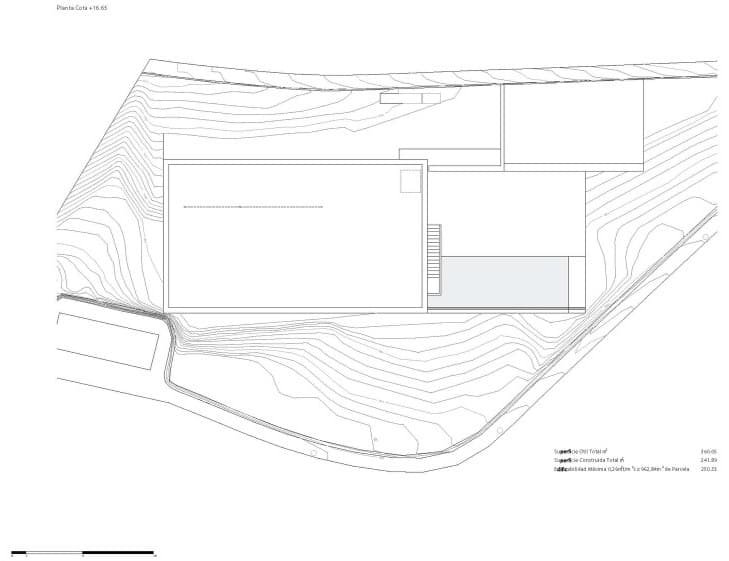 La vivienda está situada en una ladera abrupta y rocosa, con unas estupendas vistas a la costa mediterránea (Calpe, Alicante, España). Pero se construyó sin apenas alterar el terreno, empleando una estructura de muros y losas de hormigón armado. Ese diseño permite tener el programa principal de la casa en una sola planta. Y además está en la misma cota que la calle, formando una caja que parece flotar. Se deja un espacio vacío debajo que tan solo es interrumpido por el trazado de la única escalera que tiene la casa.