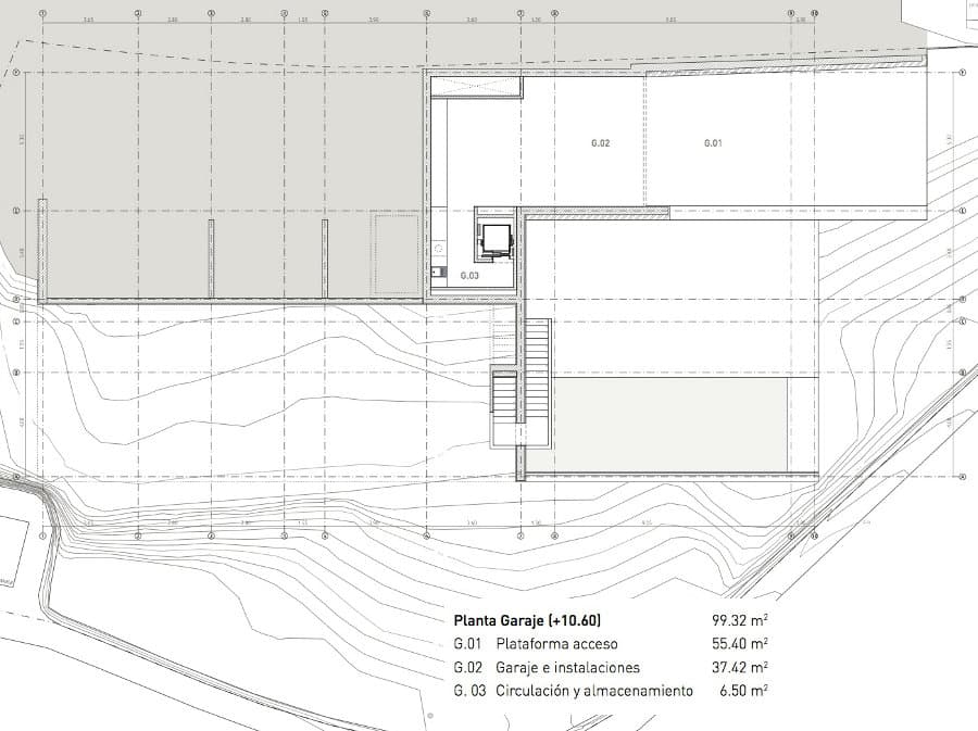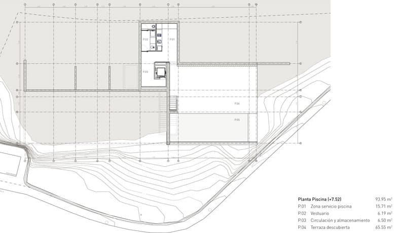 Esta escalera tiene un punto bastante poético, pues cada uno de sus tramos discurre por un lado del muro. Lo atraviesa en el punto intermedio, justo donde se convierte en un mirador privilegiado. Conduce al nivel inferior del edificio: una terraza que cuenta con una piscina desbordante. También hay unas dependencias vinculadas a ella (vestuario y zona de servicio). En la planta intermedia está el garaje, con una elegante puerta de entrada de doble hoja, pintada de blanco.