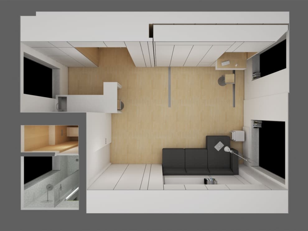 Éste es uno de los apartamentos mejor aprovechados que podamos ver, llevado a cabo con un diseño de interiores verdaderamente moderno y práctico de utilizar, pues no solo la sala principal tiene un acabado minimalista, también en el cuarto de baño y los muebles que forman la cocina se ha sabido mantener el mismo criterio. El vídeo enseña con más detalle el funcionamiento de esta primera versión de LifeEdited, así como el aspecto que tenía en un principio, antes de llevar a cabo la reforma.