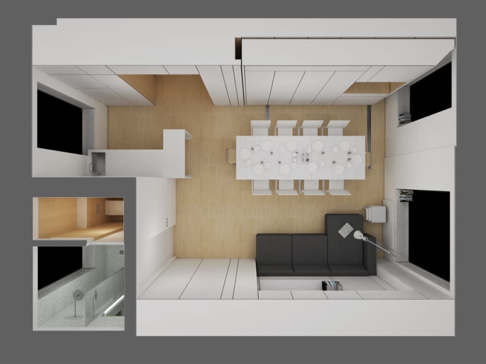 El elemento clave de este proyecto lo encontramos en su pared móvil, que permite dividir el espacio y facilitar diferentes configuraciones según las necesidades del momento, algo parecido a lo que ya vimos en otros apartamentos pequeños, como el de Closet House. Esta pared se puede deslizar con comodidad gracias a unas guías de acero embebidas en el suelo, normalmente utilizadas para bibliotecas y oficinas, que cuenta además con armarios de madera contrachapada (libre de formaldehído). El ahorro de espacio viene apoyado también por muebles modernos que tienen capacidad para transformarse y quedar escondidos en los armarios, como las camas litera para los invitados, o la cama principal, que de día queda escondida como librería para dejar espacio libre al sofá, el cual tiene cajones de almacenamiento debajo.