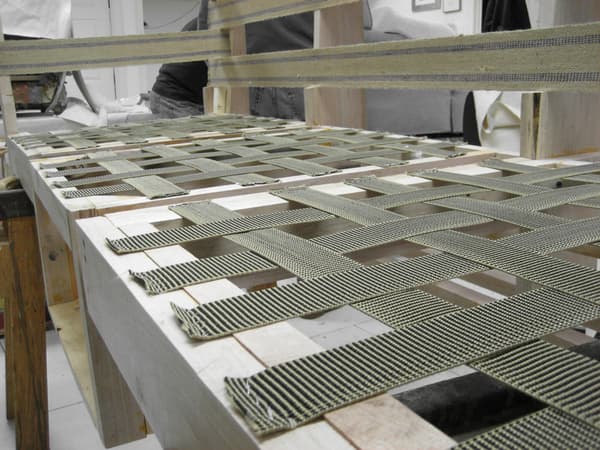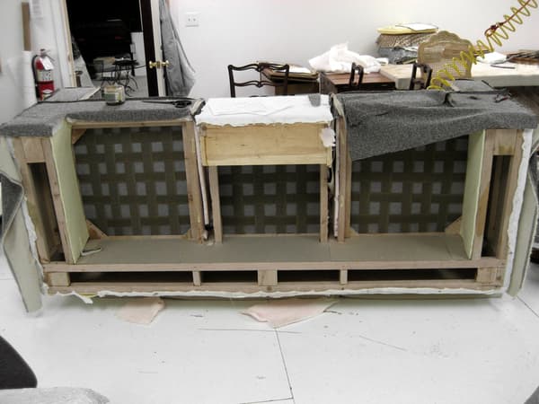 Hemos añadido fotos realizadas durante su construcción, en las que se puede observar el armazón de madera de todo el mueble, con una trama de cintas bajo cada asiento, realizados en espuma de poliuretano con tapicería textil.