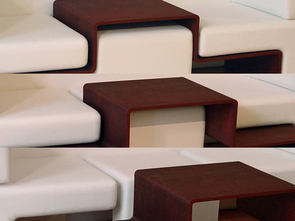 Cuando el elemento de madera se desliza fuera, el sofá funciona con capacidad para tres usuarios, con una mesa central que tiene un otomano o resposapiés (escabel) a cada lado. Este diseño podría mejorarse si la estructura de la mesa tuviera también un tablero de madera justo debajo de cada cojín (escabel), evitando que quede en contacto con el suelo cuando está escondido bajo el sofá, pero analizando la información de su autor, se puede leer que están magnéticamente fijados a una posición óptima, ya sea encima o debajo de la madera.