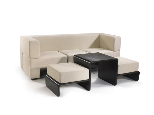 Muy interesante es el diseño del sofá SLOT, porque reúne en un mismo mueble varios elementos que lo convierten en un sofá multifuncional. Sus asientos están ligeramente separados entre sí, con la idea de permitir que una estructura de madera independiente pueda encajarse en él, quedando configurado para que dos personas compartan una mesita auxiliar en el centro.