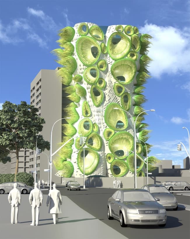 A la hora de describir las características de este bloque de pisos, se hace inevitable mencionar la curiosa disposición y tipología de sus ventanas. Tienen diferentes tamaños, y funcionan como objetos tridimensionales que dan la apariencia al edificio de un organismo vivo. Esas extrañas ‘pestañas’ son largos filamentos de fibra de vidrio que están diseñados según la orientación y exposición solar. La forma exterior de la torre también acompaña a esta idea, dándole más originalidad al conjunto, sirviendo como parte fundamental de su estructura (hormigón armado) y ayudando a la creación de amplios espacios diáfanos en su interior.