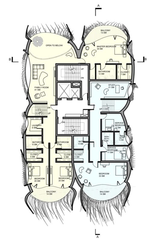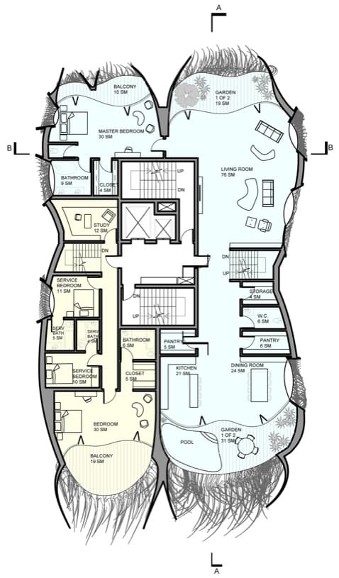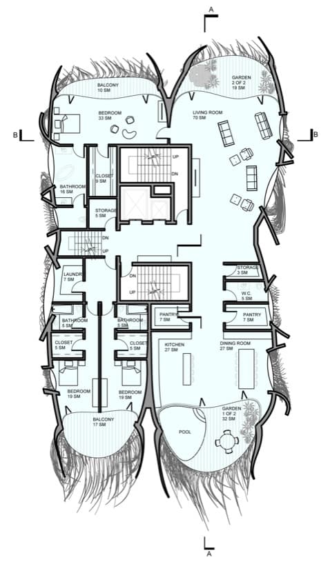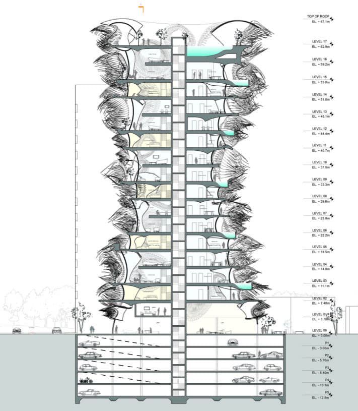 Revisando los planos de sección, es posible comprobar que cada apartamento tiene una disposición en forma de «L», provocando interesantes espacios a doble altura. Algunos disponen de una pequeña piscina, y abundan las terrazas exteriores. Otra nota curiosa es que las ventanas estarán recubiertas con láminas fotovoltaicas que aporten algo de energía limpia al condominio.